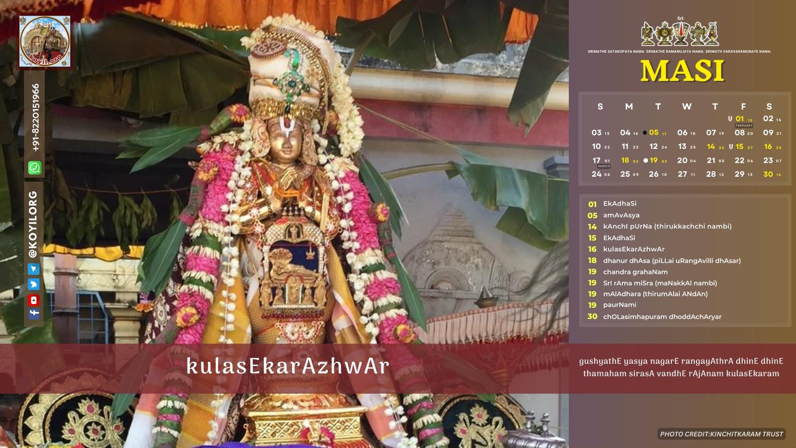 | 70 | 28-02-2026 | mAsi | punarpUsam | kulasEkarAzhwAr |