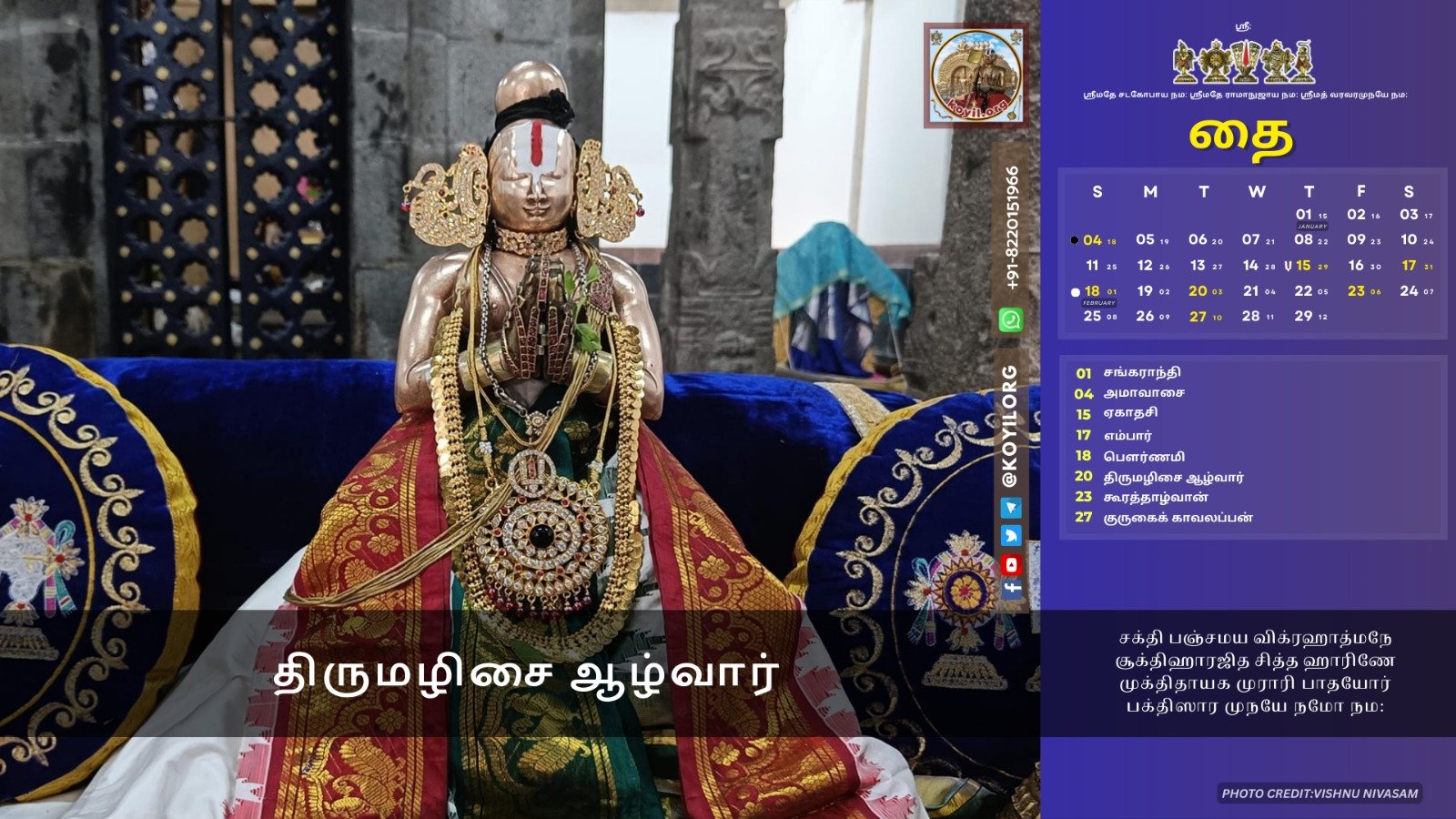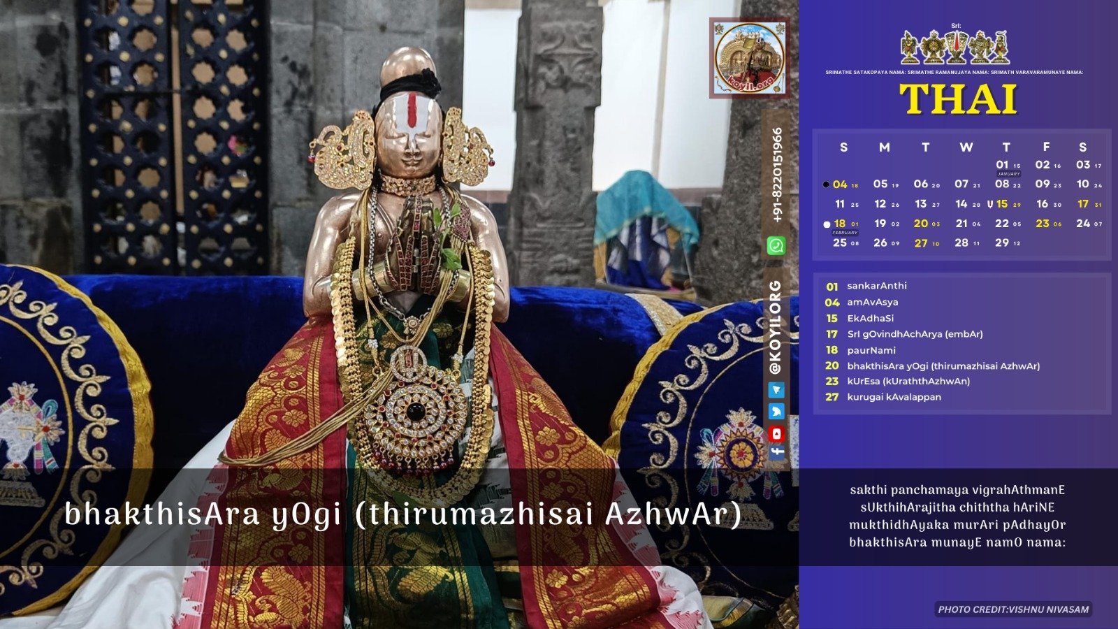 | 66 | 03-02-2026 | thai | magam | bhakthisAra yOgi (thirumazhisai AzhwAr) |