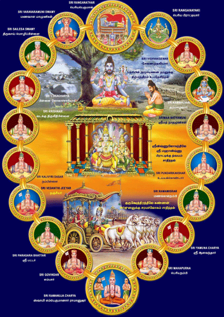 Gurú y Ācārya son sinónimos. Gurú significa alguien que disipa la ignorancia.  Ācārya significa alguien que ha aprendido el śāstra (Las escrituras auténticas), lo sigue él mismo y también hace que los demás sigan lo mismo. Gurú paramparai significa linaje ininterrumpido de Ācāryas Nuestro Śrīvaiṣṇava Guru Paramparā comienza con nada menos que el propio Śrīman Nārāyaṇan como vemos en este lakṣmīnātha samārambhām śloka. Es por la misericordia ilimitada de Śrīman Nārāyaṇan, él mismo asume la responsabilidad de despejar la ignorancia en las mentes de saṃsārīs (jīvātmās que están atados en este mundo material) para rescatarlos y darles la vida dichosa eterna en Paramapadham. Así que se convirtió en el primer Ācārya en nuestro gurú paramparai y enseñó los valiosos significados del śāstram.